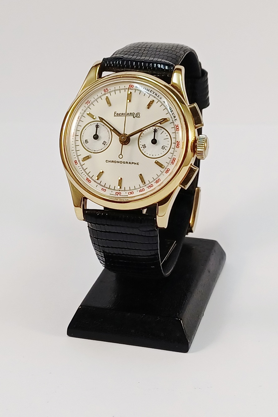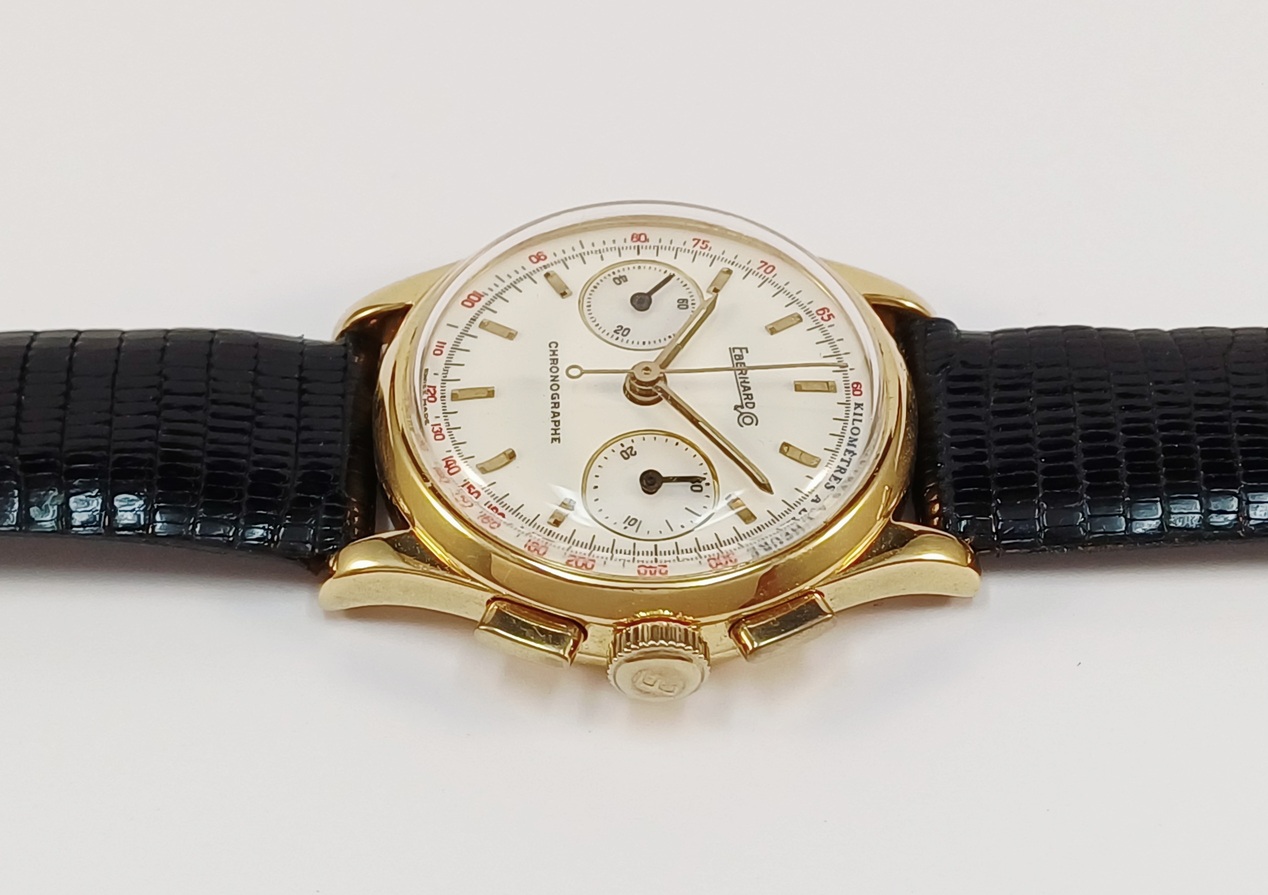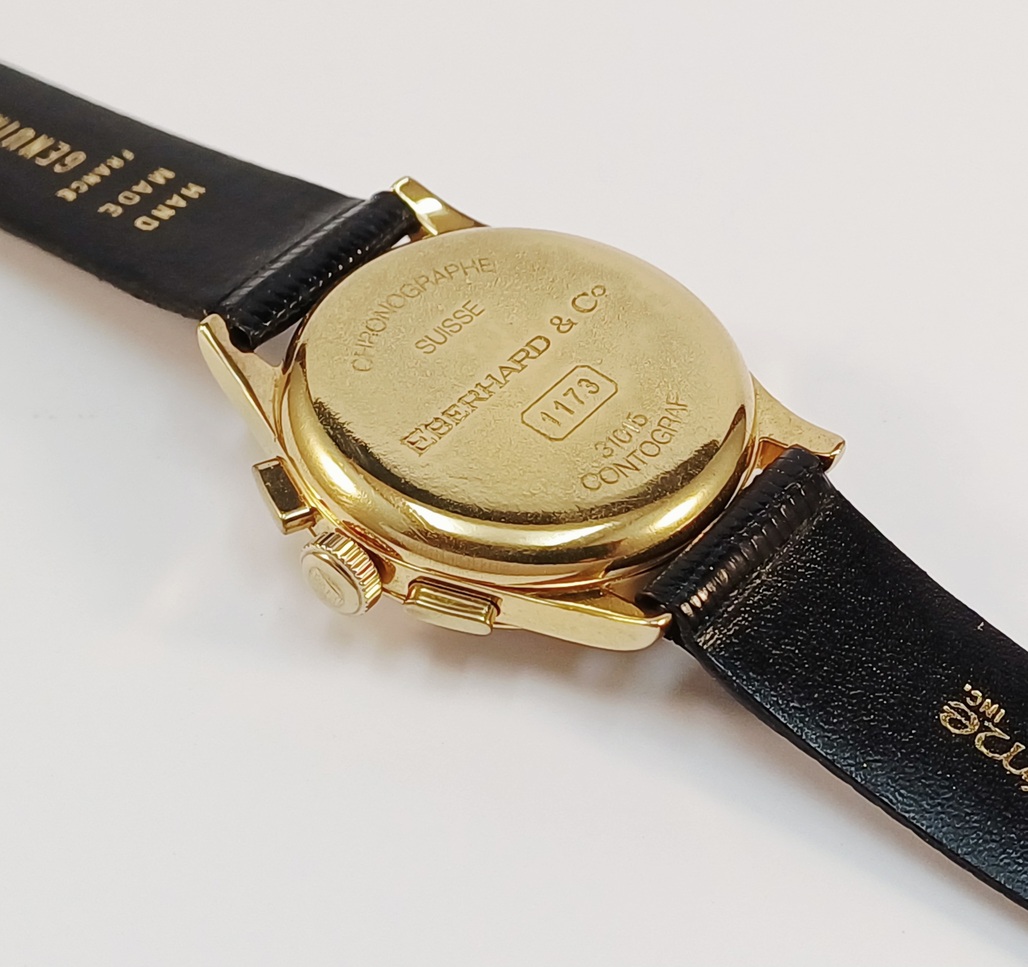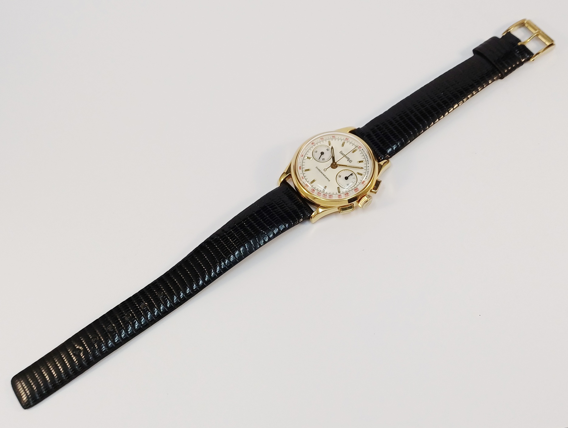 EBERHARD Contograf réf. 31015. Début des années 90. Très beau modèle de petit diamètre inspiré des Baby Chronos des années 30/40. Le boîtier a été replaqué à neuf, il mesure 32mm hors couronne/poussoirs. Cadran magnifique dont les compteurs sont nacrés. Mouvement Lemania 1872, un calibre de référence choisi par de nombreuses marques tel qu’Omega, Hamilton ( https://lepetithorloger.com/produit/hamilton-piping-rock/ ). Révisée elle fonctionne parfaitement et tient précisément l’heure. Bracelet neuf (Taille Homme) en lézard véritable.
