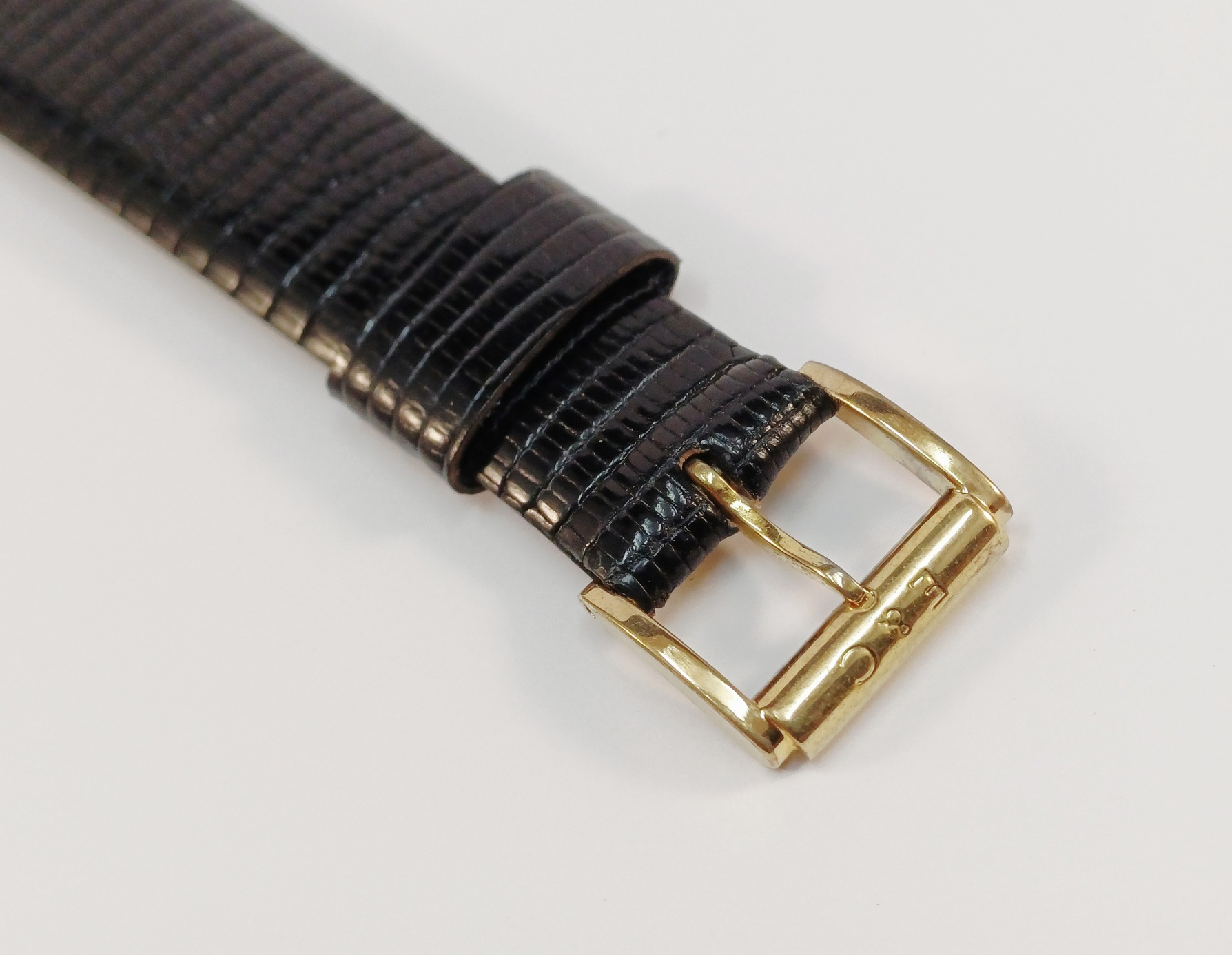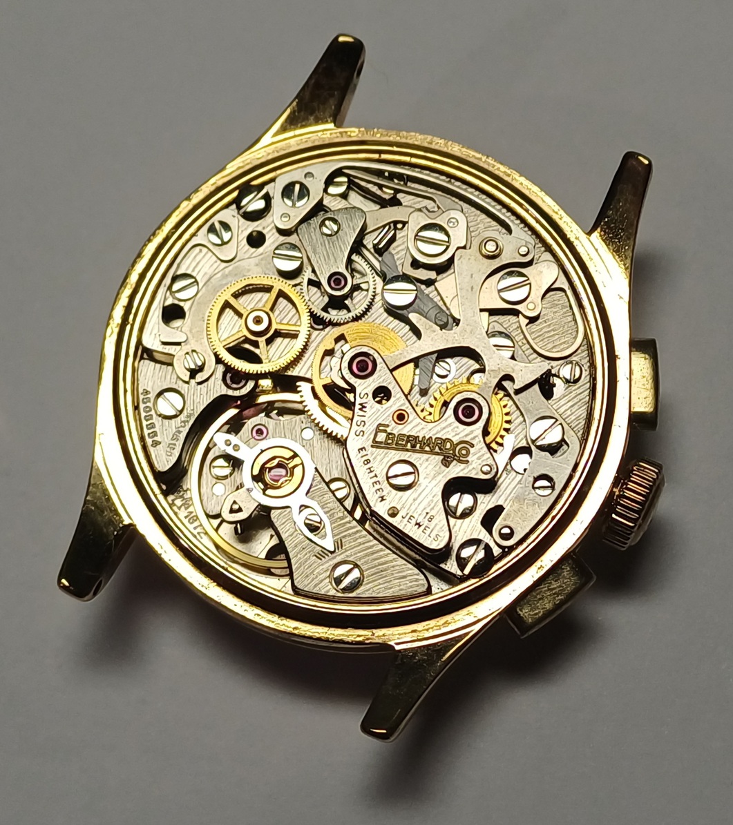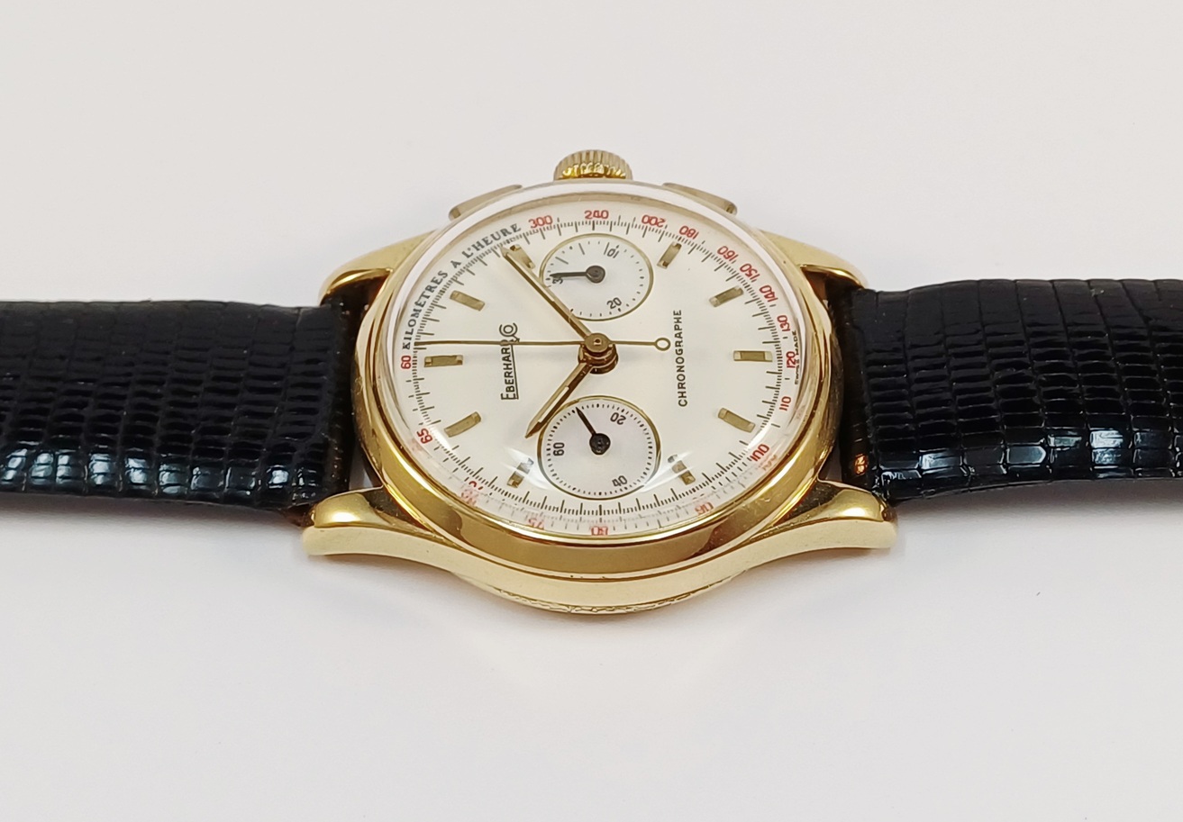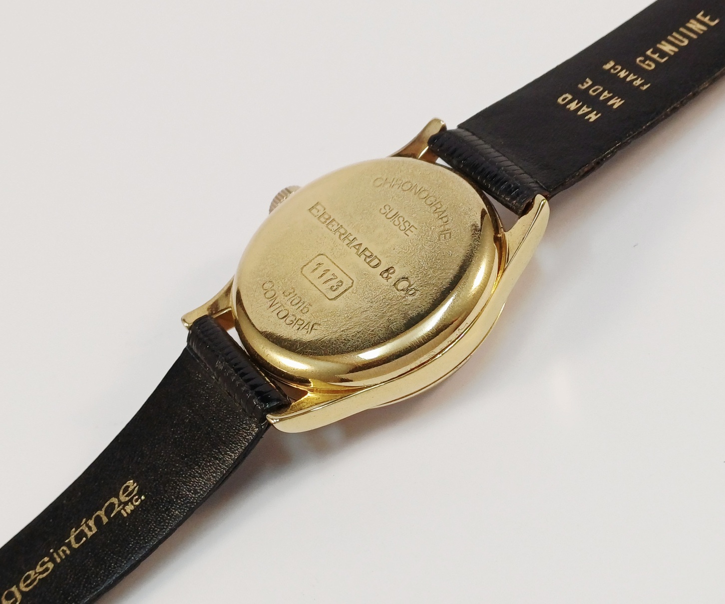 EBERHARD Contograf réf. 31015. Début des années 90. Très beau modèle de petit diamètre inspiré des Baby Chronos des années 30/40. Le boîtier a été replaqué à neuf, il mesure 32mm hors couronne/poussoirs. Cadran magnifique dont les compteurs sont nacrés. Mouvement Lemania 1872, un calibre de référence choisi par de nombreuses marques tel qu’Omega, Hamilton ( https://lepetithorloger.com/produit/hamilton-piping-rock/ ). Révisée elle fonctionne parfaitement et tient précisément l’heure. Bracelet neuf (Taille Homme) en lézard véritable.