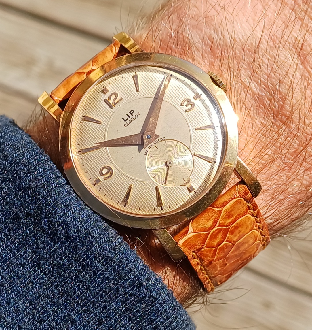 LIP R25 plaquée Or – Années 50 – Une montre vintage neuve de stock, jamais portée . Toute d’origine. Calibre LIP R25. La boîte mesure 36mm de diamètre. Révisée elle fonctionne parfaitement et tient précisément l’heure. Bracelet neuf en Emeu véritable.