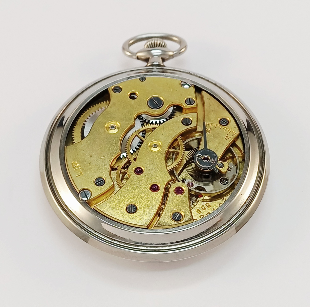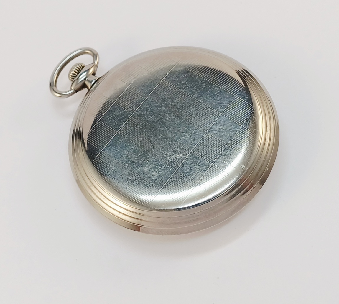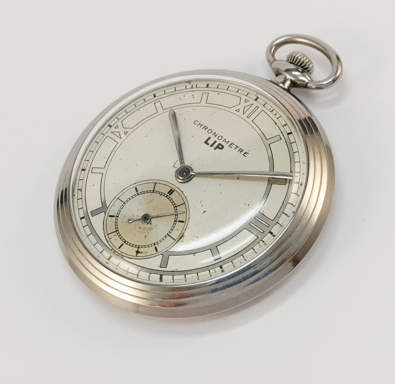 Une belle LIP de poche toute acier datant des années 40. Modèle chronomètre équipé de la fonction stop seconde, ce qui permettait à l’utilisateur de synchroniser sa montre depuis le top horaire diffusé à la radio ou l’horloge parlante. Cadran patiné. 48mm de diamètre. Verre neuf. Intégralement révisée elle fonctionne parfaitement et tient précisément l’heure.