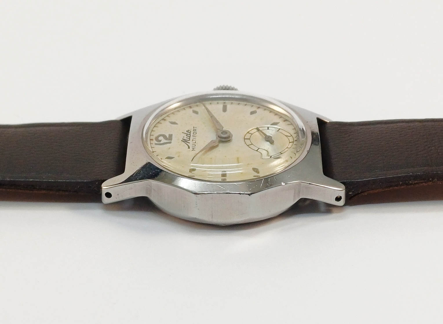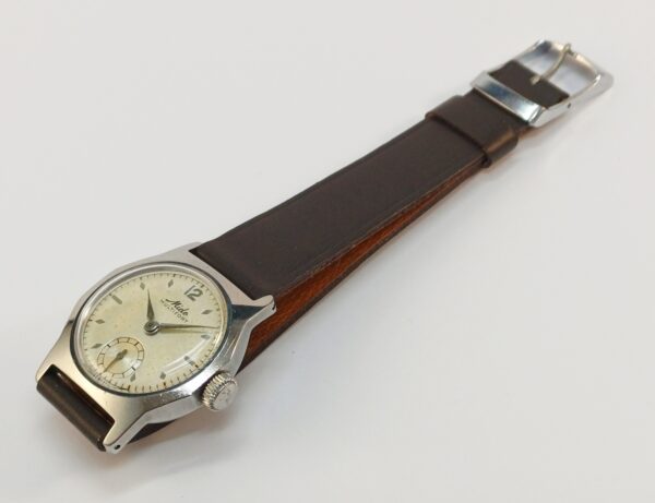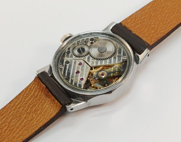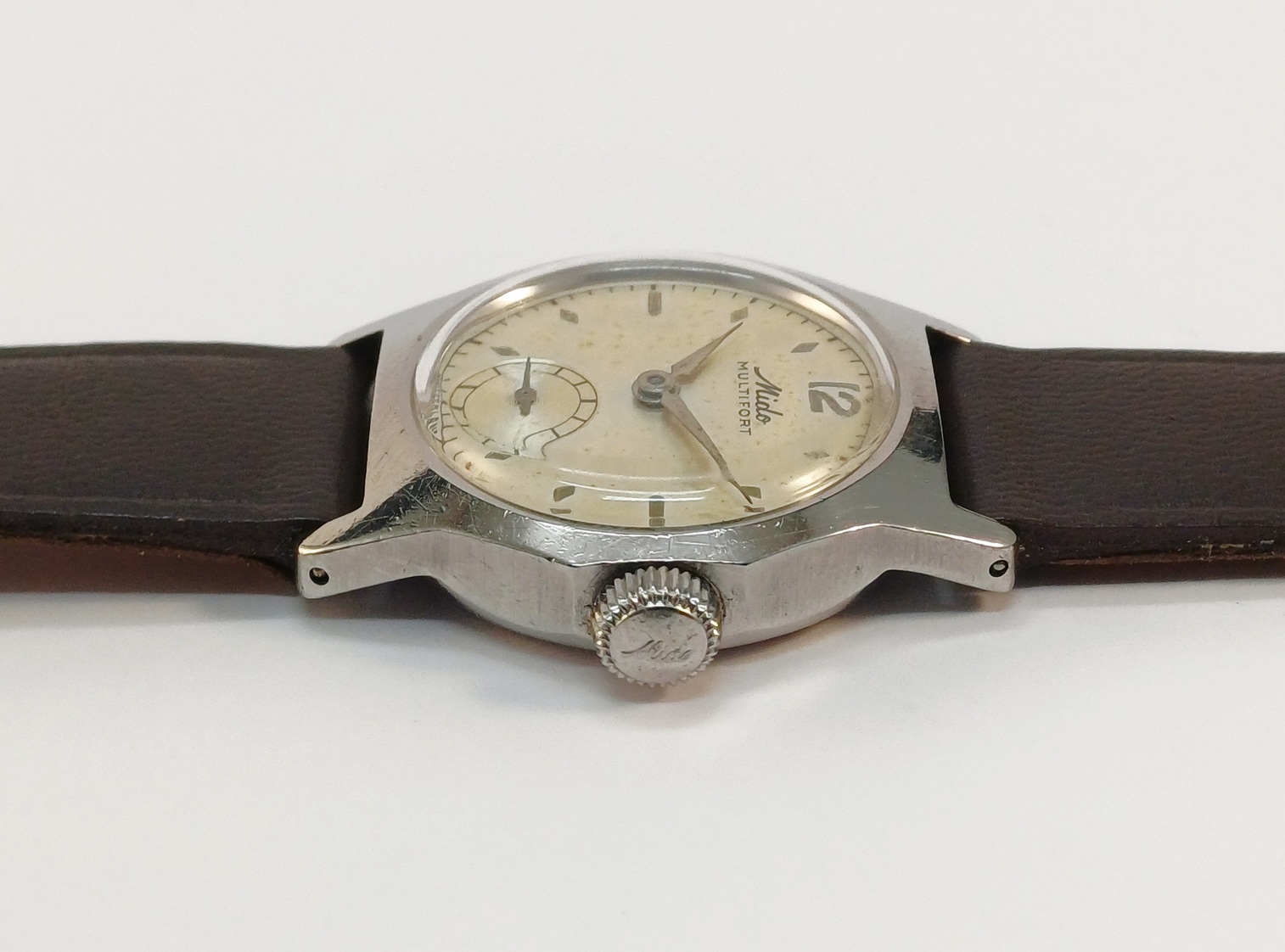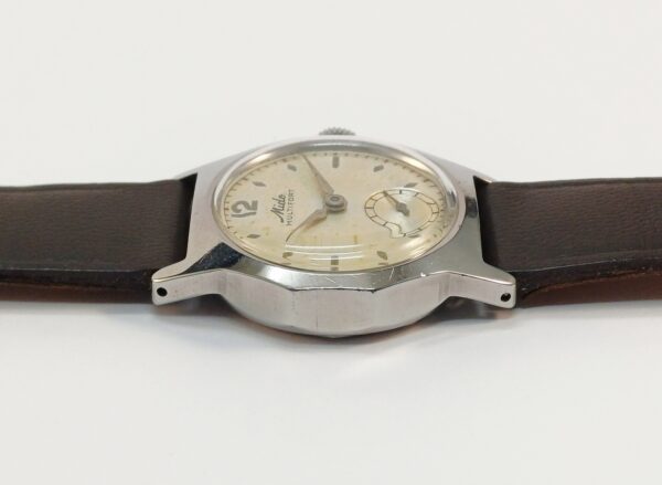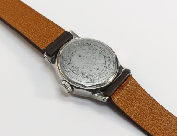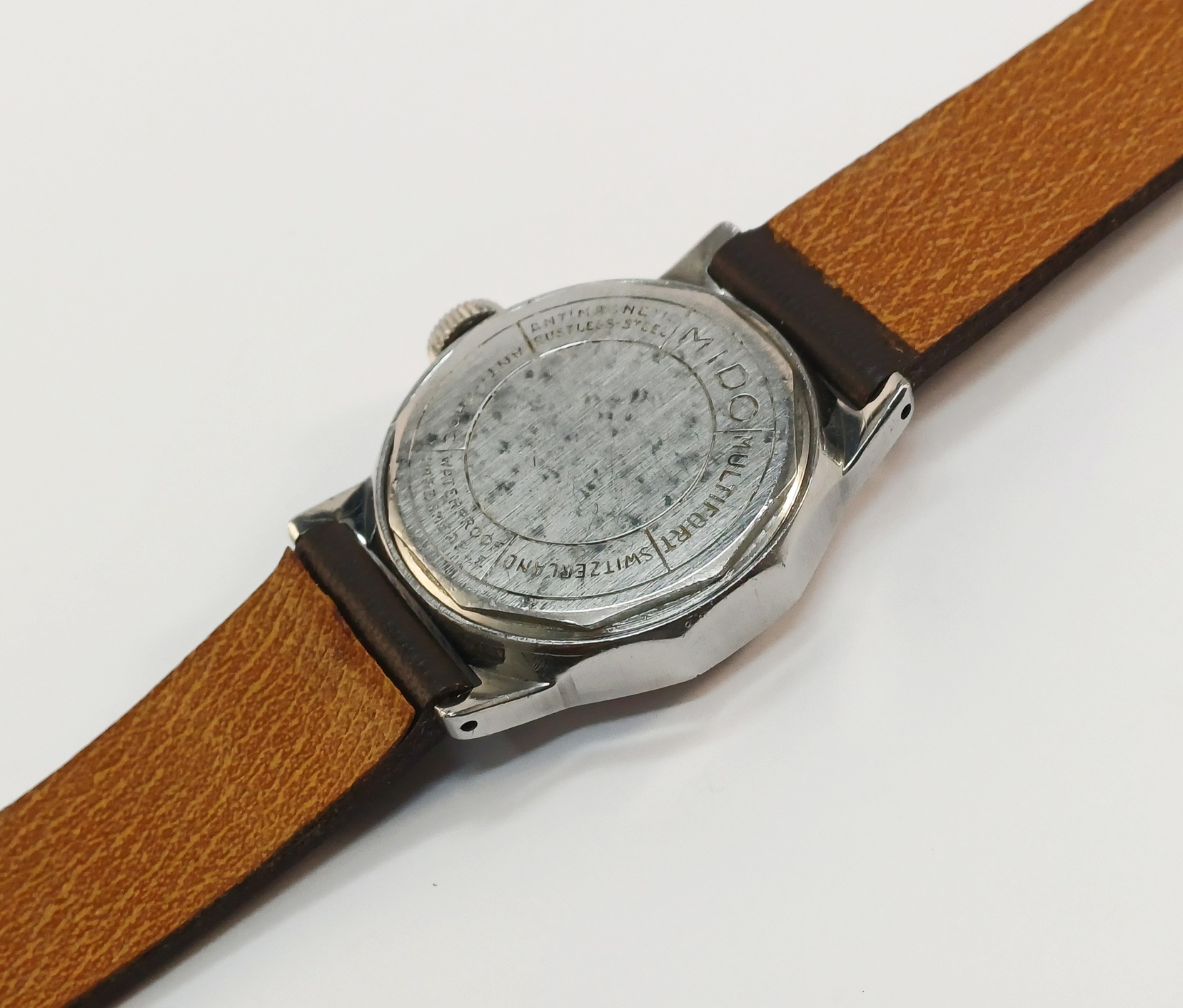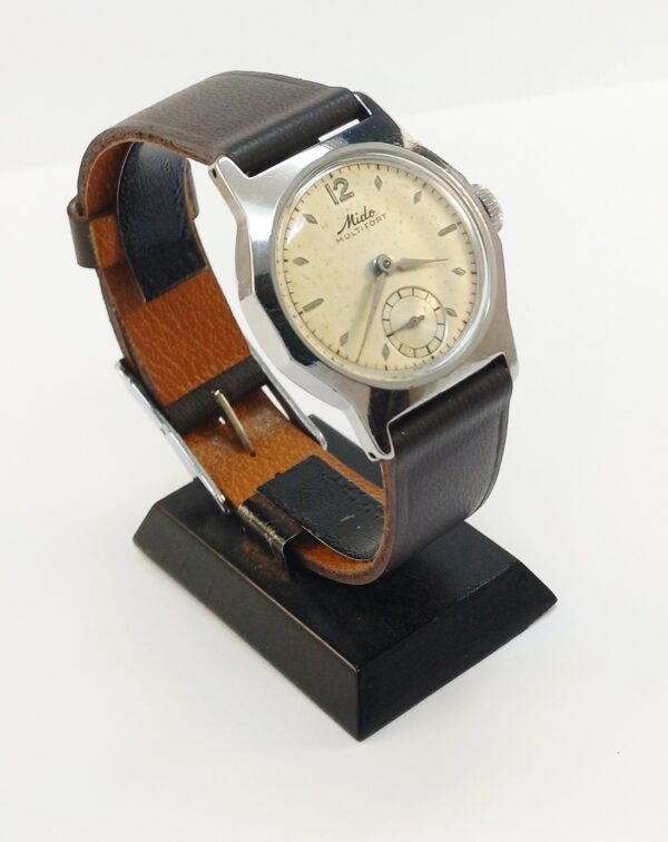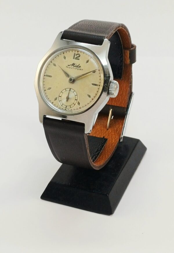 MIDO Multifort. Modèle Kitchener. Une belle montre pour hommes datant du début des années 50. Diamètre 29mm hors couronne. Toute d’origine, équipée d’un beau mouvement à remontage manuel 1002 révisé et fonctionnant parfaitement. Numéro de série 1511825. Bracelet cuir neuf marron foncé.